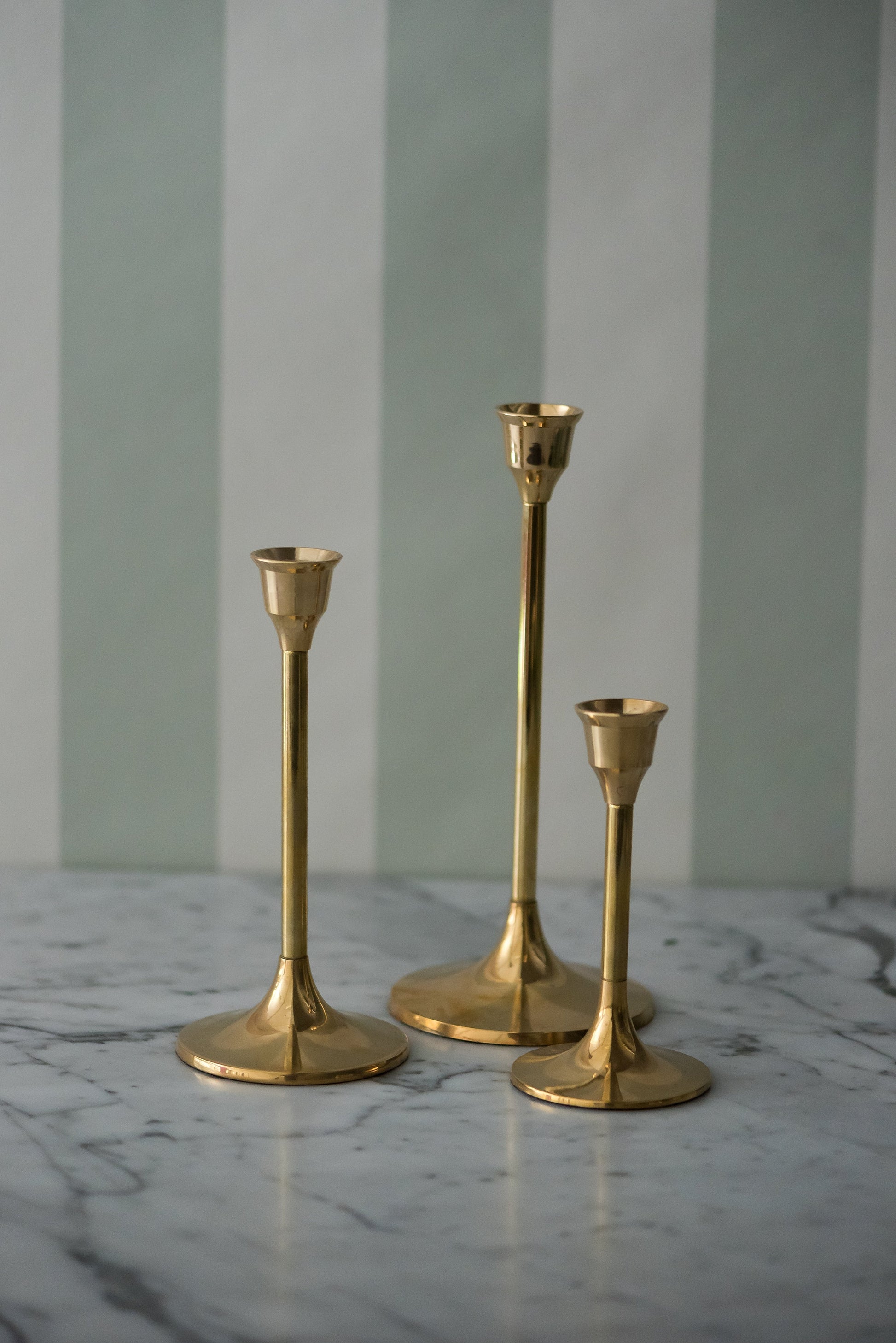 Brass candlesticks, 5”, 7”, and 9” tall, can basically go anywhere you desire. Whether you want to dress up a mantel piece, style a dining table, host a halloween party, or have an intimate dinner party, these brass candle holders won't let you down.