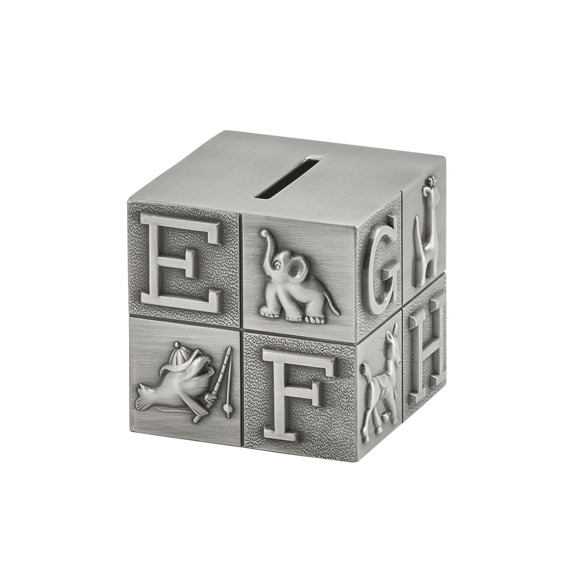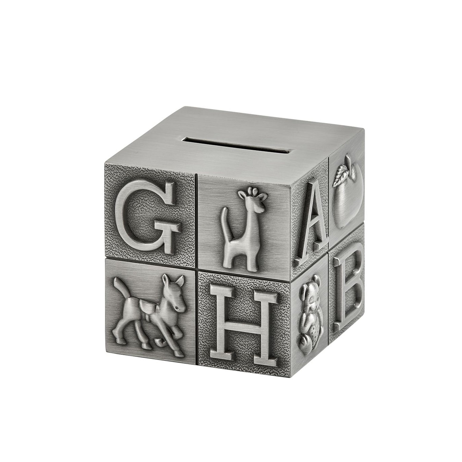 Our ABC Block Bank is a traditional keepsake gift featuring raised alphabet letters with corresponding animals or icons. Letters A thru H are shown on the bank along with the following animals - A - Apple, B - Bear, C - Cat, D - Duck, E - Elephant, F - Fish, G - Giraffe, H - Horse. This bank is produced in a non tarnish brushed pewter finish. The coin slot is located on the top of the bank and there is a engraving area of 1.25" x 3" on each side of the coin slot. Overall dimensions are 3" square. Silver gift box.