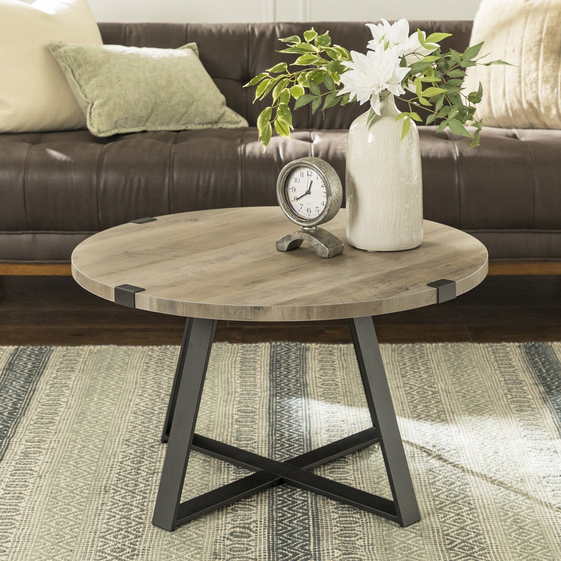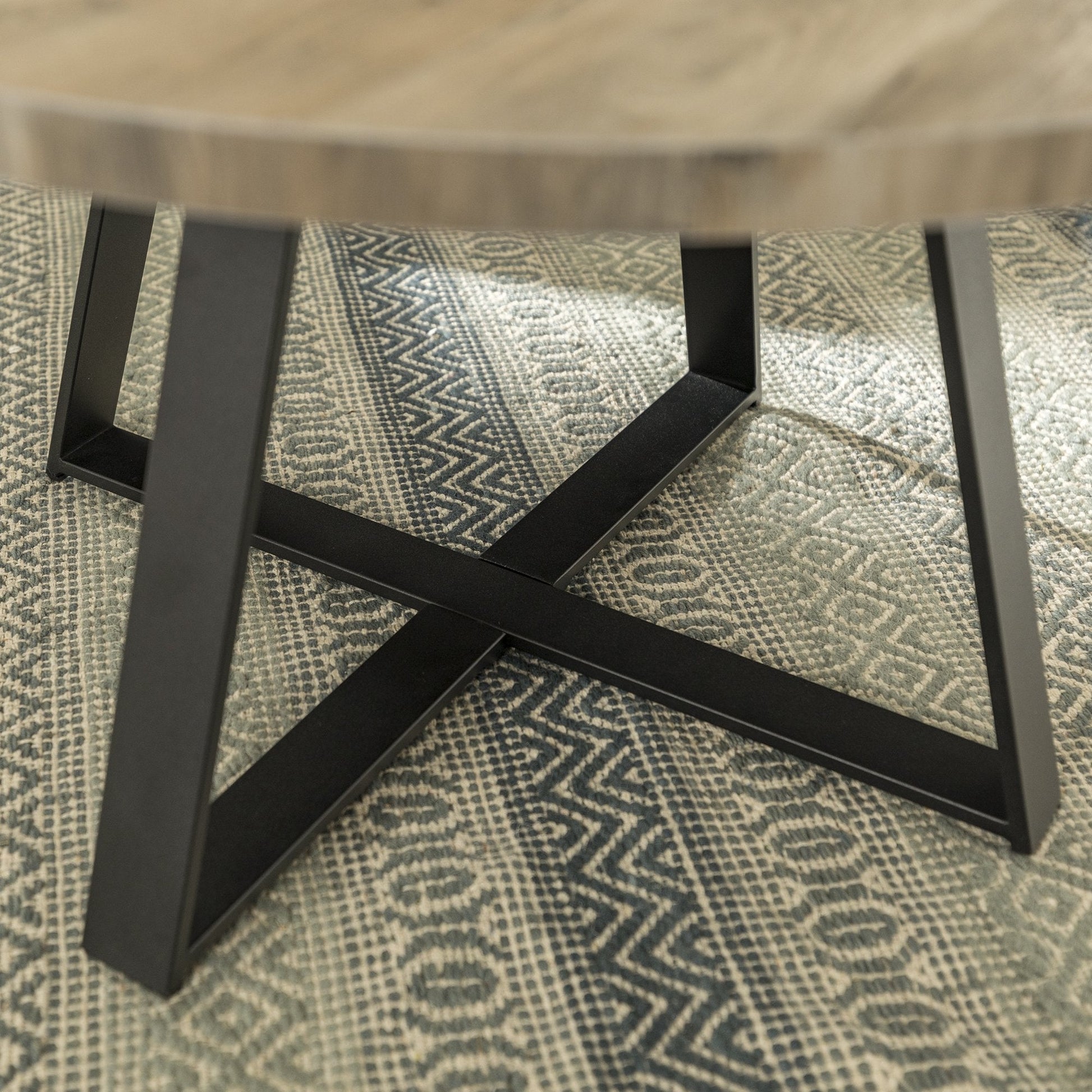 Give your living room some rustic style with our industrial inspired coffee table. Black painted metal accents are featured on the top corners and x-shaped sides, which contrast beautifully with the wood textured surface made from durable laminate. Our coffee table provides just enough space for placing down items from your TV remote to your mail, while also having a shelf underneath for simple storage or decor.