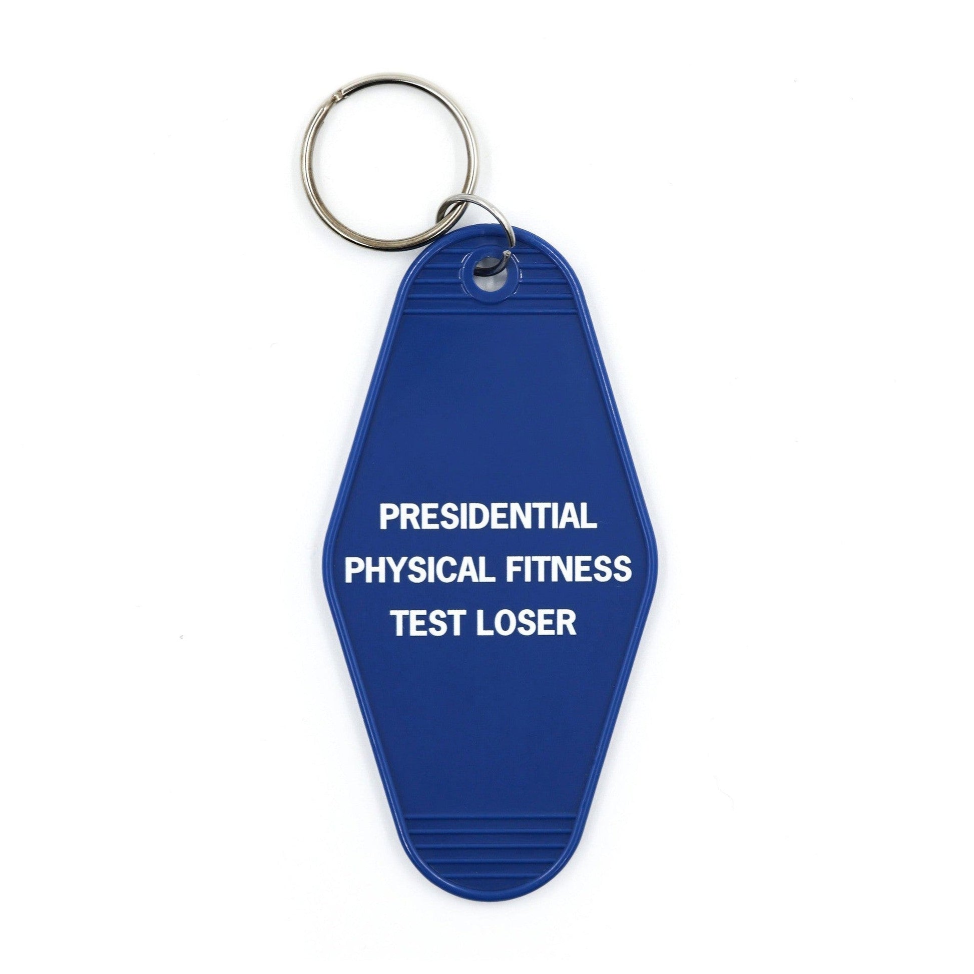 Blue keychain reads: PRESIDENTIAL PHYSICAL FITNESS TEST LOSER in white lettering