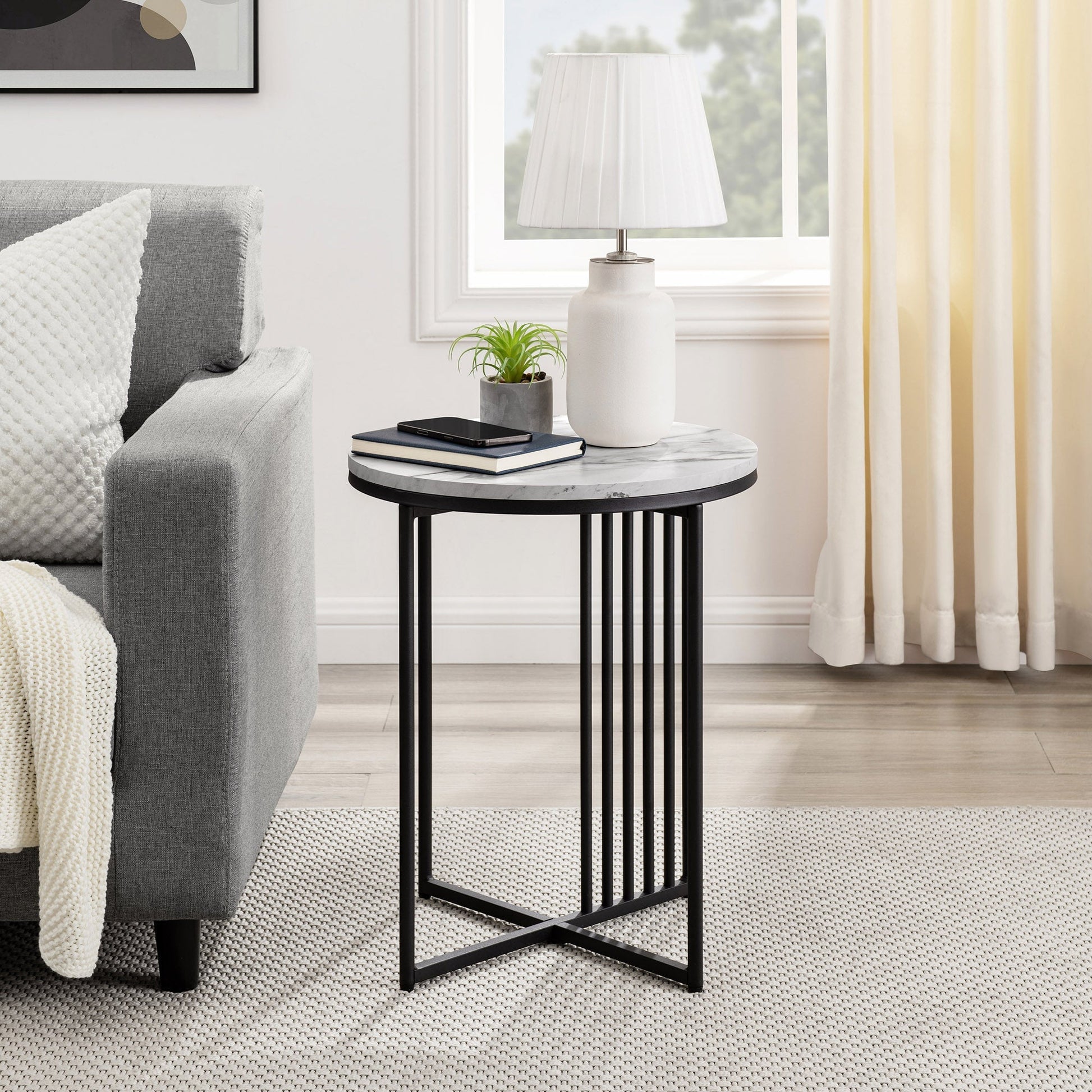 The sleekest couchside companion, this contemporary side table will lend your place an effortless upgrade with its mixed material design and metal details. The vertical metal slats add just the right amount of ultra-modernity to the accent table, while a stunning, durable laminate finish over MDF wood offers a unique tabletop. With an easy assembly, lightweight build, and weight capacity of 100 pounds, this occasional table is just what you’ve been looking for, whether it’s for your apartment or forever home.