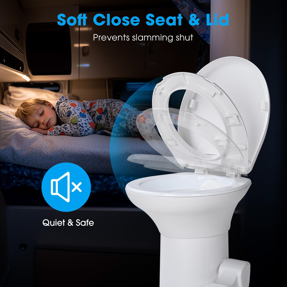 Experience the ultimate in RV bathroom comfort with Yescom Gravity Flush Camper RV Toilet. Made from HDPE for sturdy construction and with a porcelain bowl that resists stains and buildup. Our high-powered two-directional flush nozzles ensure complete waste removal, while the soft-closing seat and lid prevent slamming for a peaceful and odor-free experience. Upgrade your RV bathroom today!