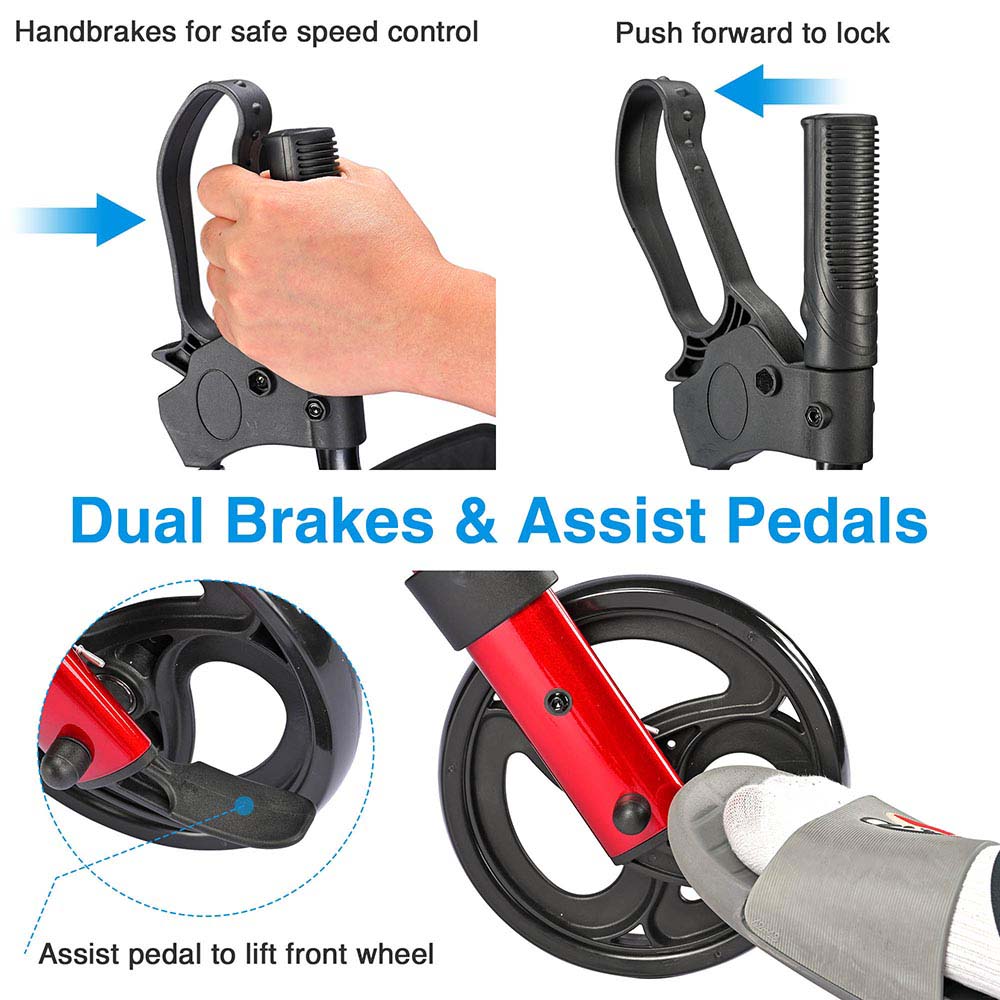- Dual Brakes & Assist Pedals - Press handbrakes for an emergency stop or slowing down when going down the slope, or pull down to lock rear wheels when you need to stand up or park the rollator; Assist pedals on 2 rear wheels to help you lift front wheels a little bit for easier rolling over uneven road surface.